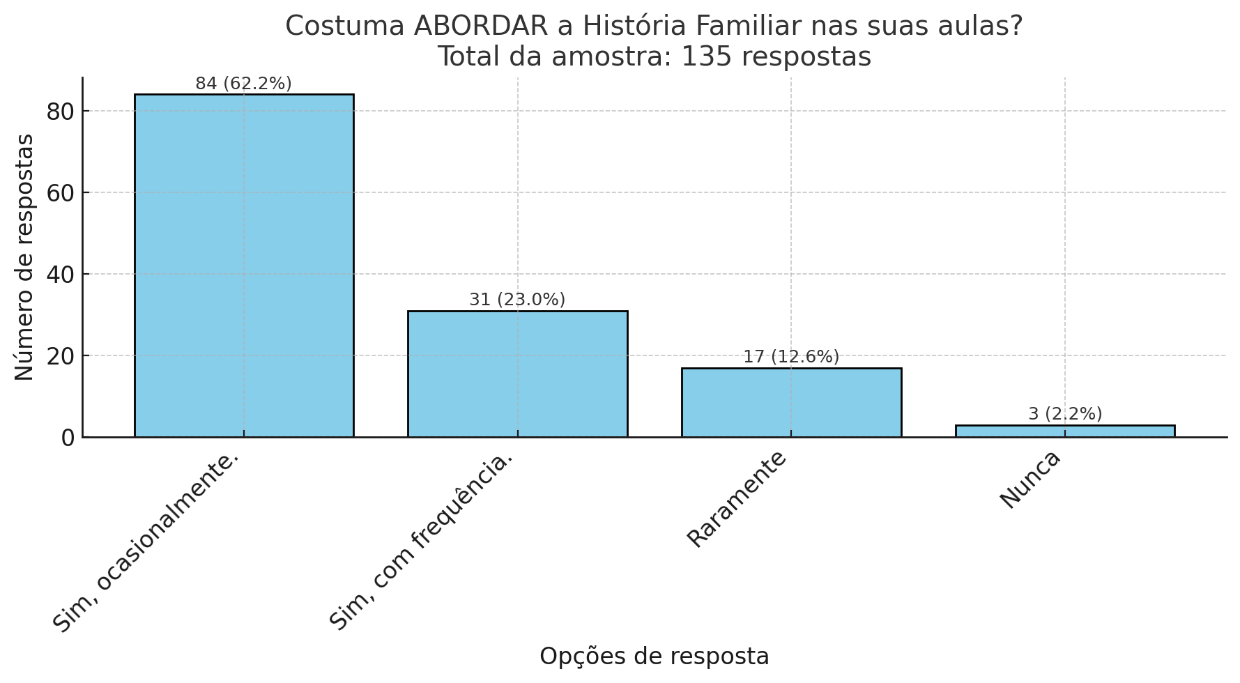 Quanto à frequência com que o tema é abordado, 84 docentes (62,2%) afirmaram fazê-lo ocasionalmente e 31 (23,0%) com frequência, enquanto 17 (12,6%) o fazem raramente e apenas 3 (2,2%) nunca o abordaram (Figura 1). Estes resultados mostram que, para a maioria, a história familiar já é um elemento integrado no ensino, embora de forma não totalmente sistemática.