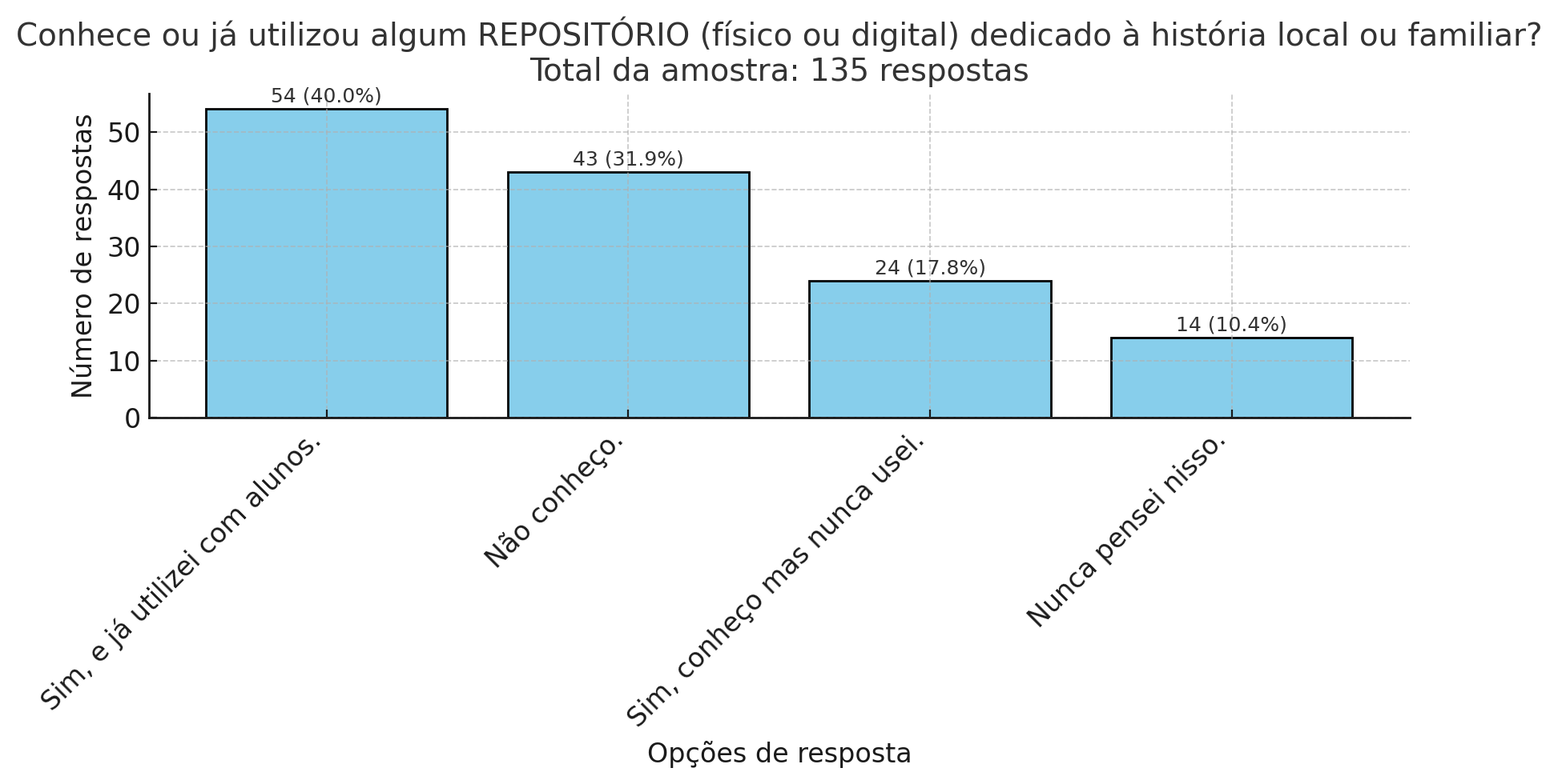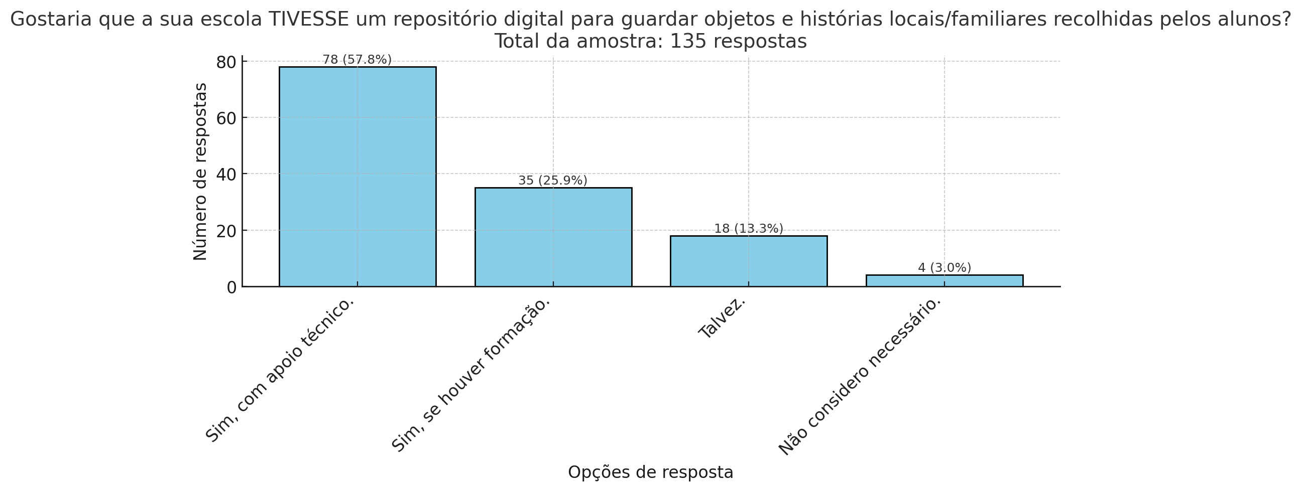 Em síntese, os dados evidenciam uma forte valorização da história familiar e dos objetos como recurso educativo, acompanhada de práticas relativamente frequentes, ainda que desiguais entre docentes. O elevado interesse por repositórios digitais e formação específica aponta para um potencial significativo de desenvolvimento de projetos pedagógicos inovadores, articulando património, memória e participação ativa dos alunos.