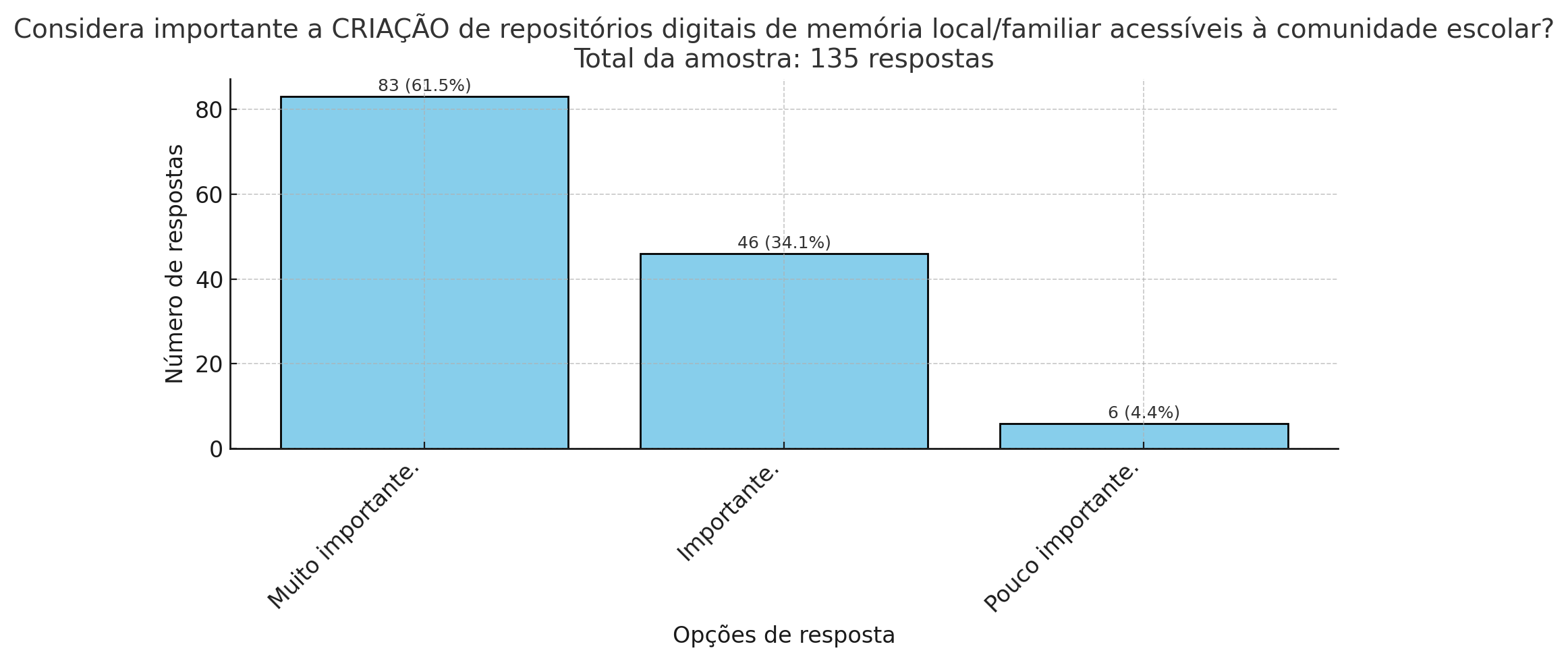 A dimensão pedagógica foi igualmente avaliada. O inquérito nacional a 135 professores de História revelou que 84,4% concordam plenamente que objetos familiares são fontes tão importantes como documentos escritos e 83,7% defendem a preservação sem reservas 11. Além disso, 61,5% consideram fundamental criar repositórios digitais escolares. Estes números demonstram que o exemplo de Bucelas pode inspirar outras comunidades e escolas, reforçando a ligação entre história, educação e cidadania.