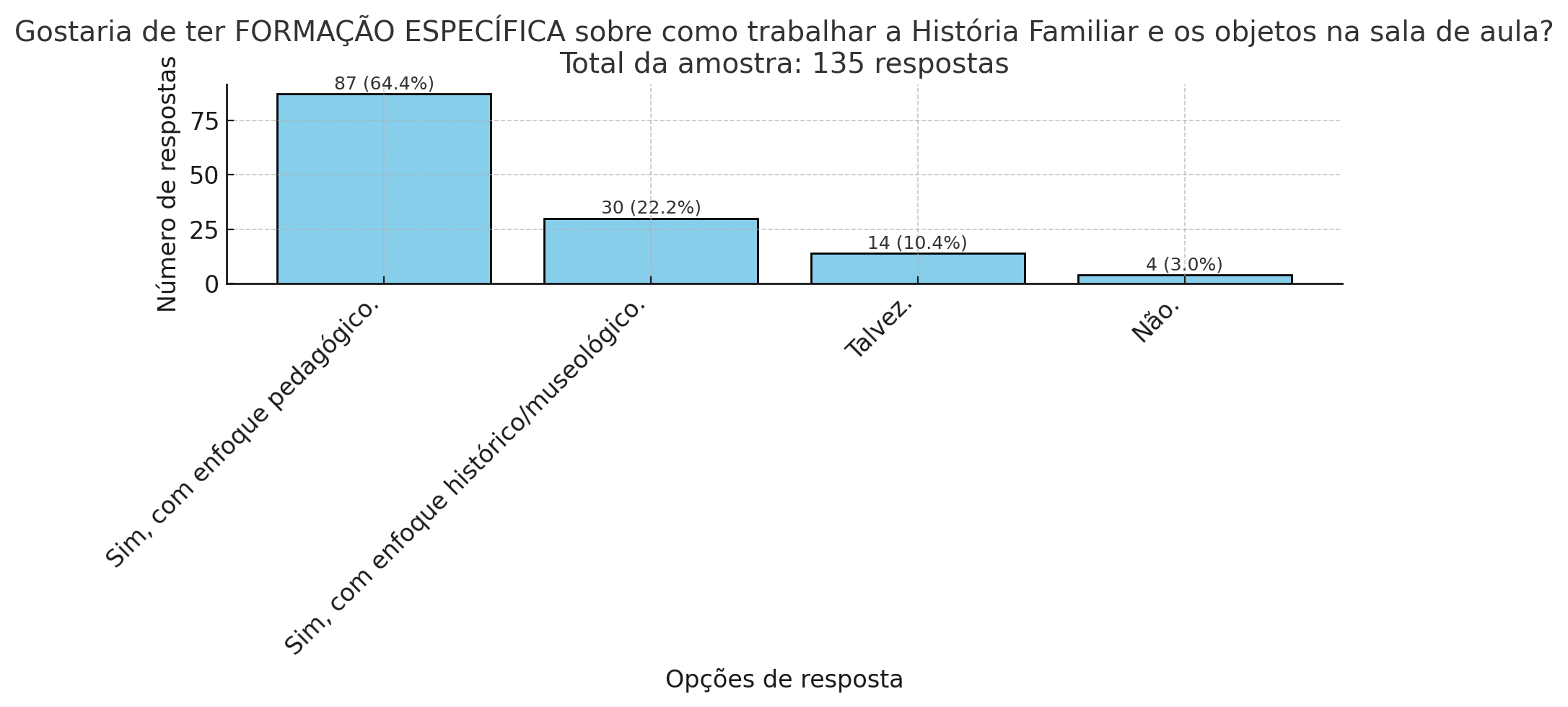 De forma coerente, 78 docentes (57,8%) gostariam que a escola tivesse um repositório com apoio técnico, 35 (25,9%) condicionam à existência de formação, 18 (13,3%) responderam “talvez” e 4 (3,0%) não o consideram necessário (Figura 12). Por fim, sobre formação específica para trabalhar história familiar e objetos, 87 (64,4%) preferem um enfoque pedagógico, 30 (22,2%) um enfoque histórico/museológico, 14 (10,4%) responderam “talvez” e 4 (3,0%) rejeitam a necessidade (Figura 13).