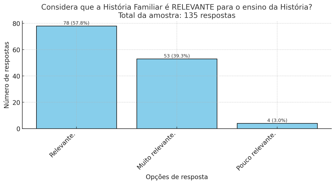 Nesta secção, optou-se por recolher a perspetiva de docentes de História sobre a utilização da história familiar como recurso didático, através de um inquérito online. O questionário foi enviado a professores da disciplina e obteve 135 respostas válidas, permitindo caracterizar de forma robusta as perceções e práticas associadas a este tema. O objetivo foi compreender se este recurso já é trabalhado nas aulas, de que forma é implementado e qual a perceção do seu valor educativo.