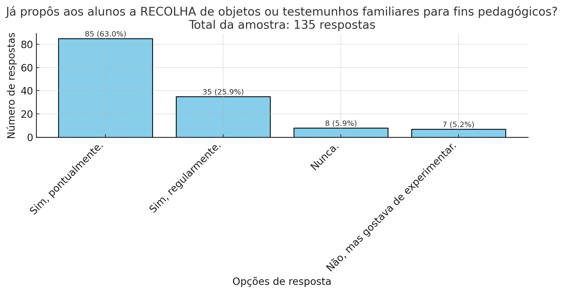 No que diz respeito à relevância atribuída à história familiar, 78 professores (57,8%) consideram-na relevante e 53 (39,3%) muito relevante, sendo apenas 4 (3,0%) a classificá-la como pouco relevante (Figura 2). Este reconhecimento é acompanhado de práticas concretas: 85 docentes (63,0%) já propuseram a recolha de objetos ou testemunhos familiares de forma pontual, 35 (25,9%) fazem-no regularmente, 8 (5,9%) nunca o fizeram e 7 (5,2%) manifestaram vontade de experimentar (Figura 3).