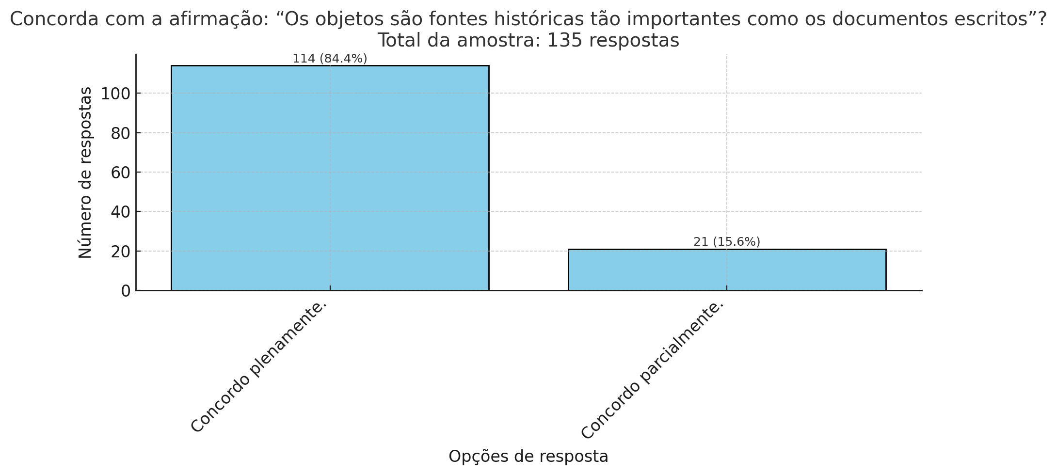 A perceção do valor dos objetos históricos é quase consensual. 114 professores (84,4%) concordam plenamente que os objetos são fontes históricas tão importantes como os documentos escritos e 21 (15,6%) concordam parcialmente (Figura 4). Esta opinião reflete-se na utilização efetiva: 81 docentes (60,0%) utilizam objetos ocasionalmente, 44 (32,6%) frequentemente, 9 (6,7%) raramente e apenas 1 (0,7%) nunca os utiliza (Figura 5).