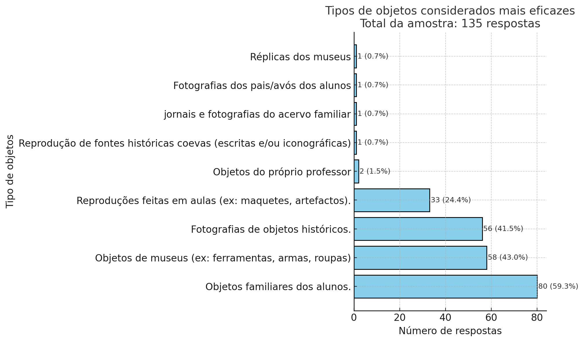 A análise individual das opções (Figura 6) revela que os professores dão clara preferência a recursos com ligação direta à vivência dos alunos: “Objetos familiares dos alunos” foram mencionados por 80 docentes (59,3%), “Objetos de museus (ex: ferramentas, armas, roupas)” por 58 (43,0%) e “Fotografias de objetos históricos” por 56 (41,5%). As “Reproduções feitas em aulas (ex: maquetes, artefactos)” ocupam a quarta posição, referidas por 33 professores (24,4%). Entre as escolhas menos frequentes surgem “Objetos do próprio professor” (2 respostas; 1,5%), bem como “Reprodução de fontes históricas coevas”, “jornais e fotografias do acervo familiar”, “Fotografias dos pais/avós dos alunos” e “Réplicas dos museus”, todas com apenas 1 referência (0,7%).