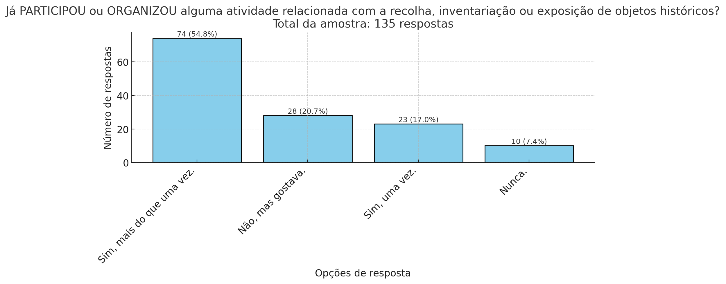 A participação em atividades de recolha, inventariação ou exposição de objetos também é expressiva: 74 professores (54,8%) participaram mais de uma vez, 23 (17,0%) pelo menos uma vez, 28 (20,7%) nunca o fizeram mas gostariam e 10 (7,4%) nunca participaram nem manifestaram interesse (Figura 8).