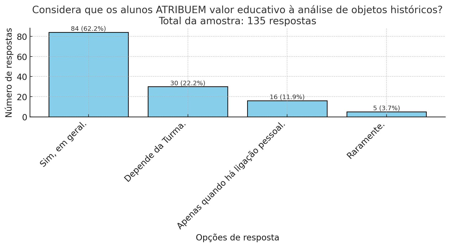 Sobre a perceção dos alunos, 84 docentes (62,2%) acreditam que estes atribuem valor educativo à análise de objetos históricos, 30 (22,2%) afirmam que depende da turma, 16 (11,9%) consideram que o interesse surge apenas quando há ligação pessoal e 5 (3,7%) raramente observam valorização (Figura 9).